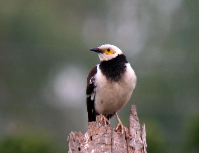 เป็นนกจำพวกนกเอี้ยง ขนาดค่อนข้างใหญ่กว่าชนิดอื่น ตัวผู้และตัวเมียมีลักษณะคล้ายกัน ขนบนหลังและปีกมีสีเทาเข้มแต้มด้วยรอยขีดสีขาว บนหัว อกและด้านใต้เป็นสีขาว บริเวณคอมีคาดสีดำเป็นแถบขนาดใหญ่ แต่นกตัวที่ยังไม่โตเต็มที่ไม่มีแถบสีดำนี้